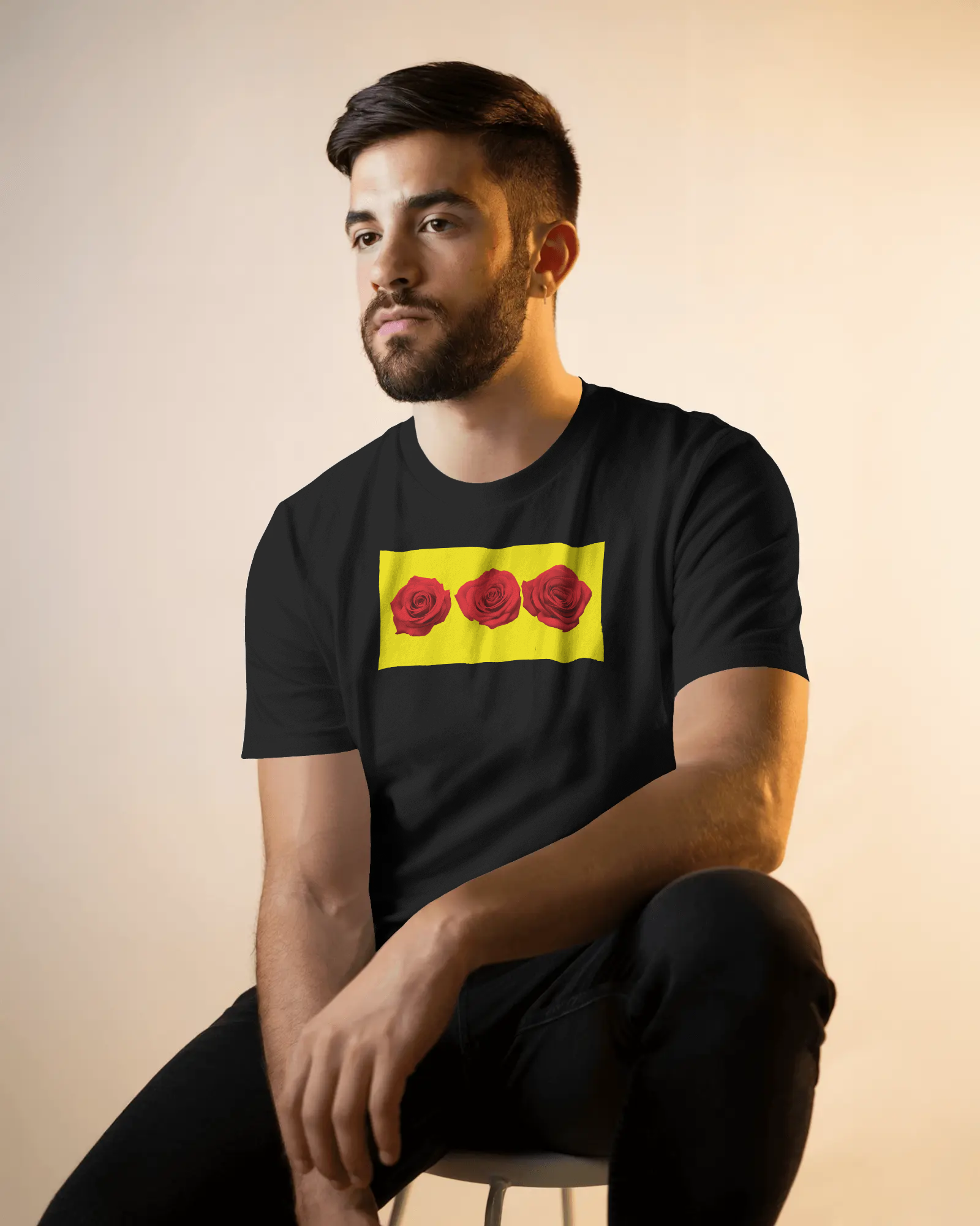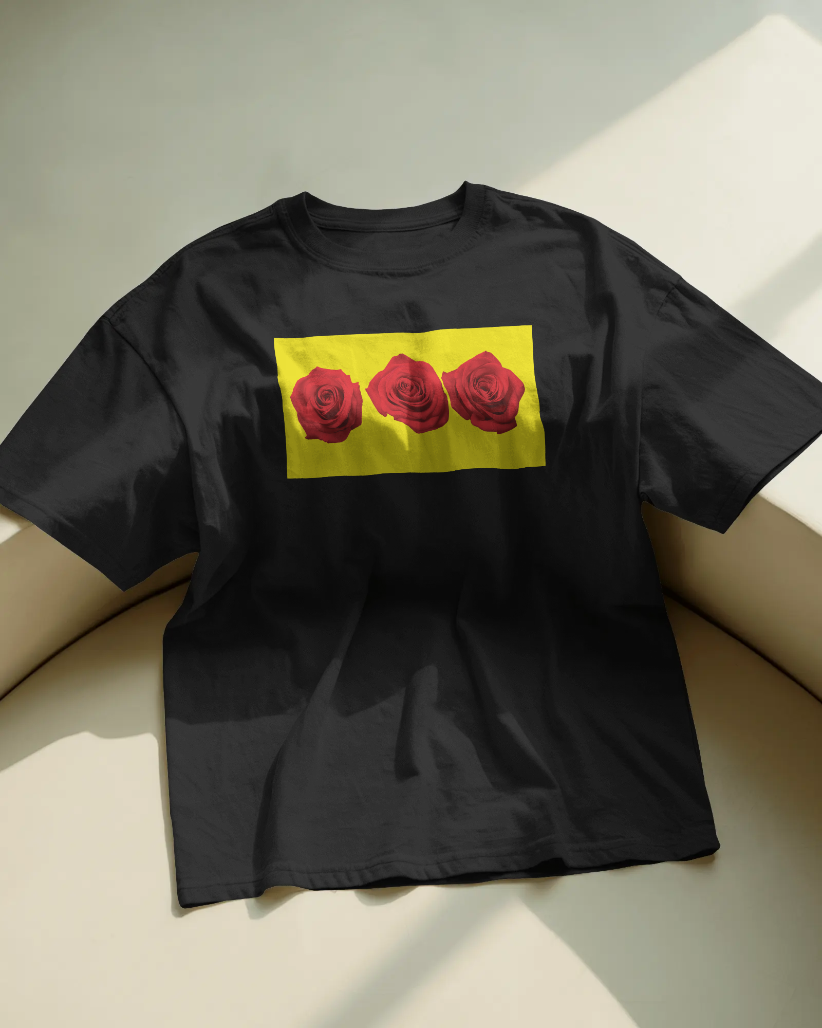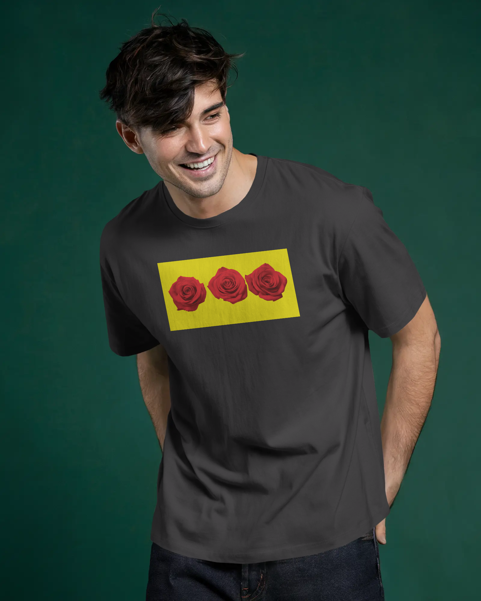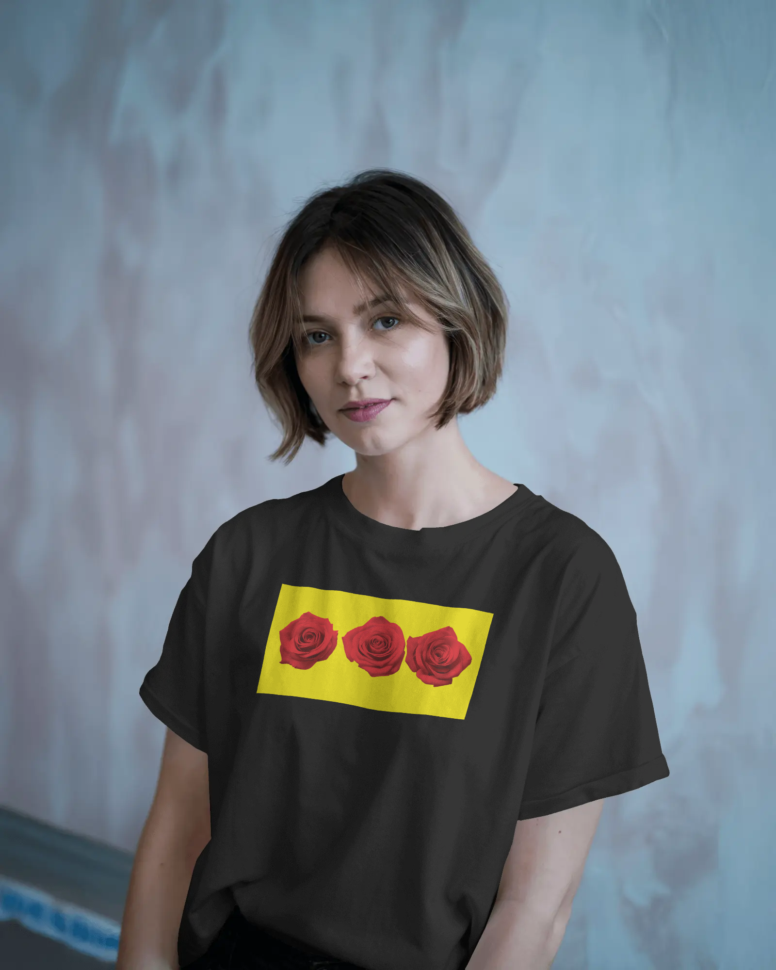 This shirt features a striking minimalist design with a bold yellow box centered on the chest, creating a bright and eye-catching backdrop. Inside and overlapping the edges of the box are three vivid red roses, illustrated in a bold, graphic style that balances elegance with strength. The contrast between the sunny yellow square and the deep crimson petals gives the design a modern, artistic feel—symbolizing passion framed in warmth. Perfect for anyone who loves clean, statement-making artwork with a touch of romance.