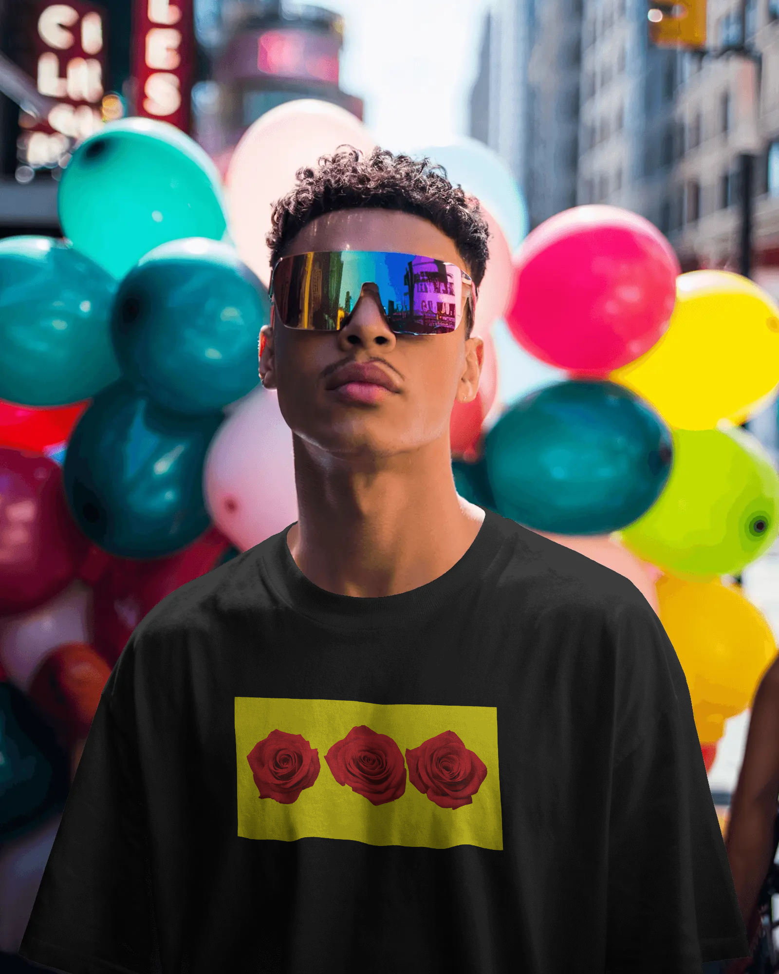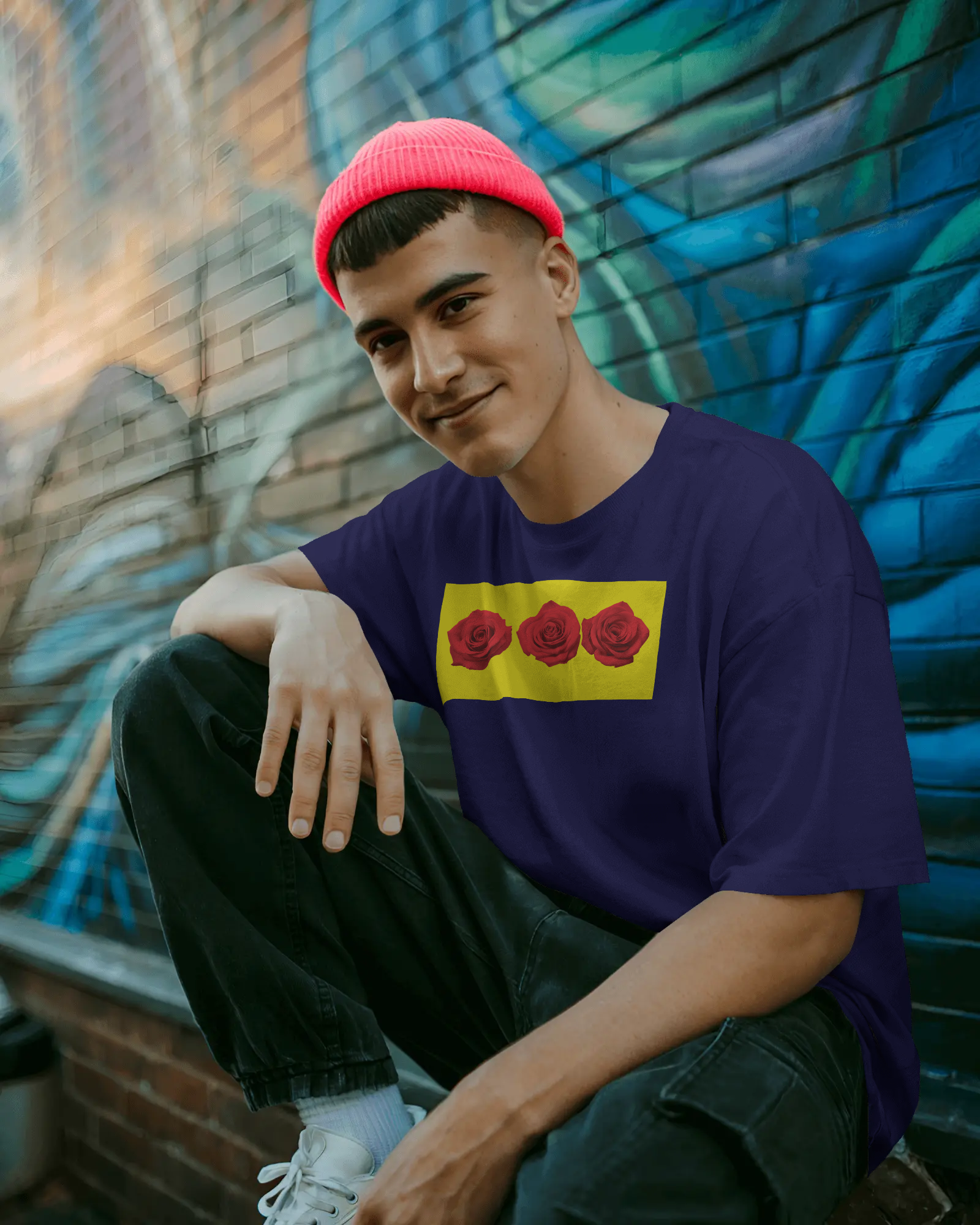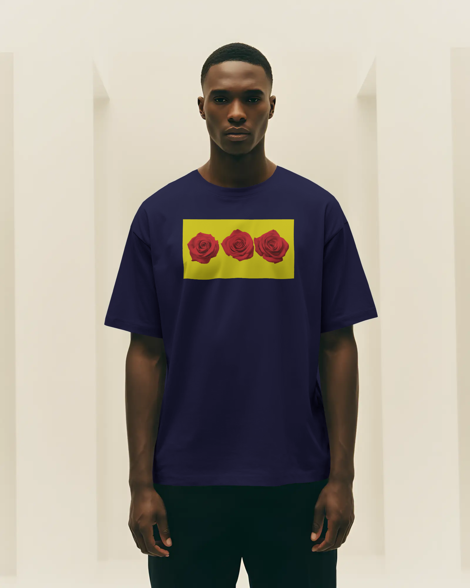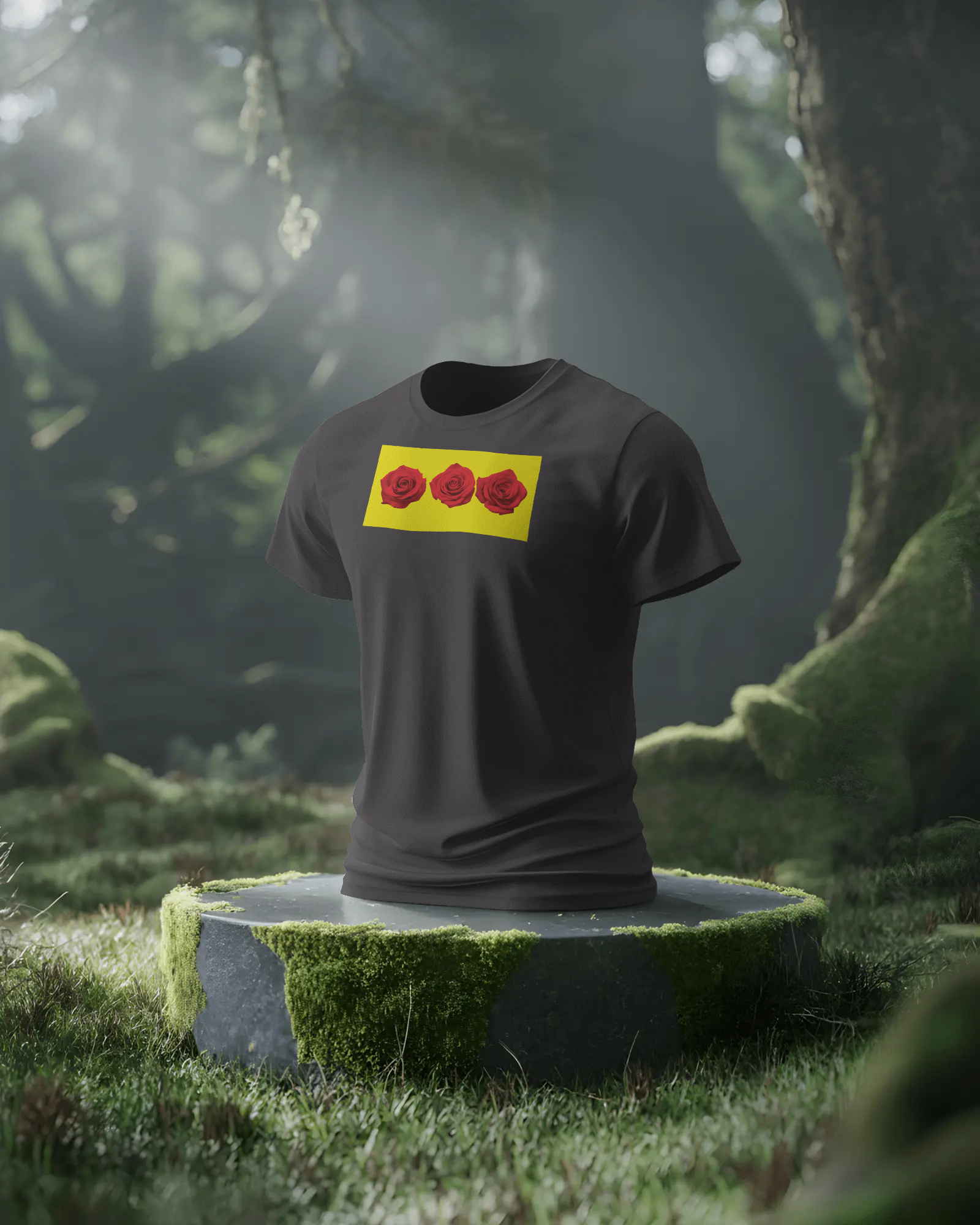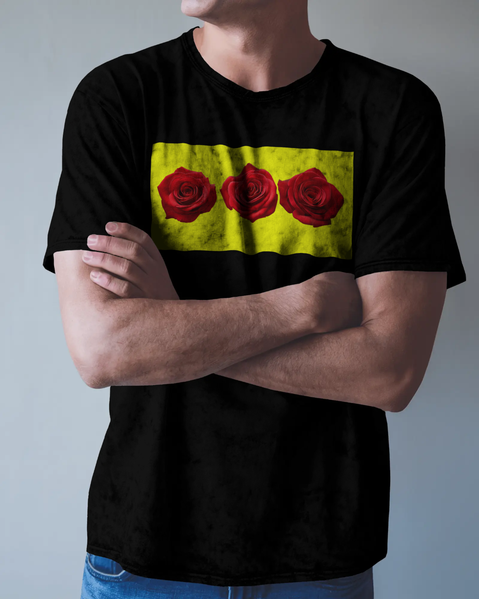 This shirt features a striking minimalist design with a bold yellow box centered on the chest, creating a bright and eye-catching backdrop. Inside and overlapping the edges of the box are three vivid red roses, illustrated in a bold, graphic style that balances elegance with strength. The contrast between the sunny yellow square and the deep crimson petals gives the design a modern, artistic feel—symbolizing passion framed in warmth. Perfect for anyone who loves clean, statement-making artwork with a touch of romance.