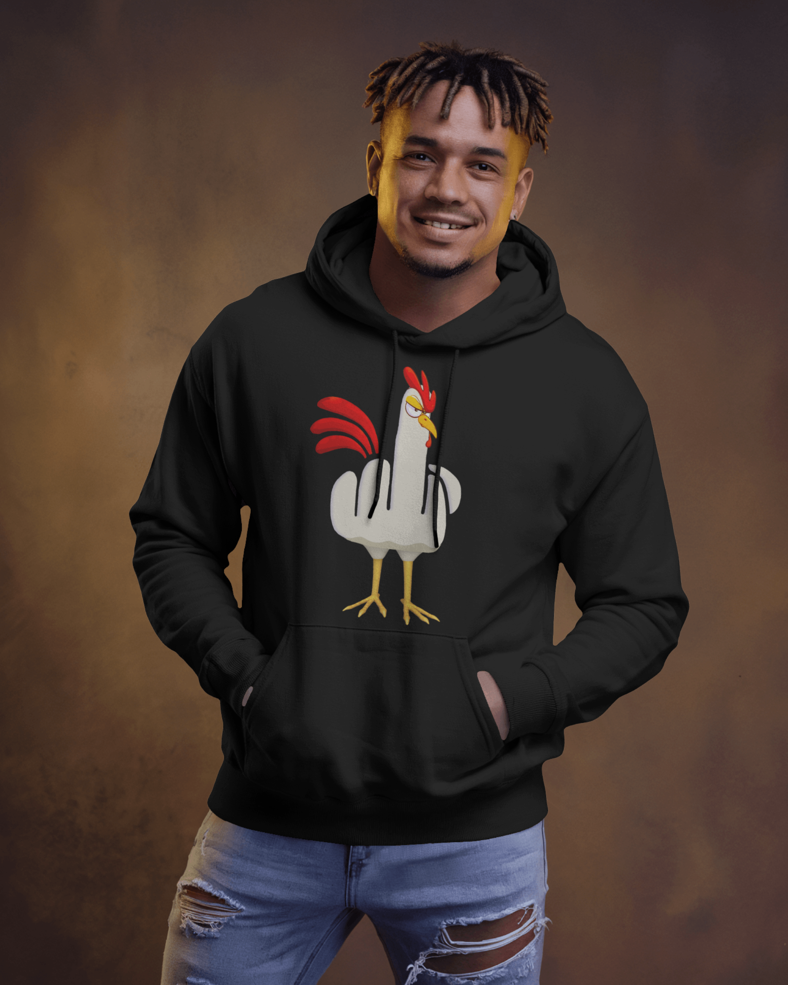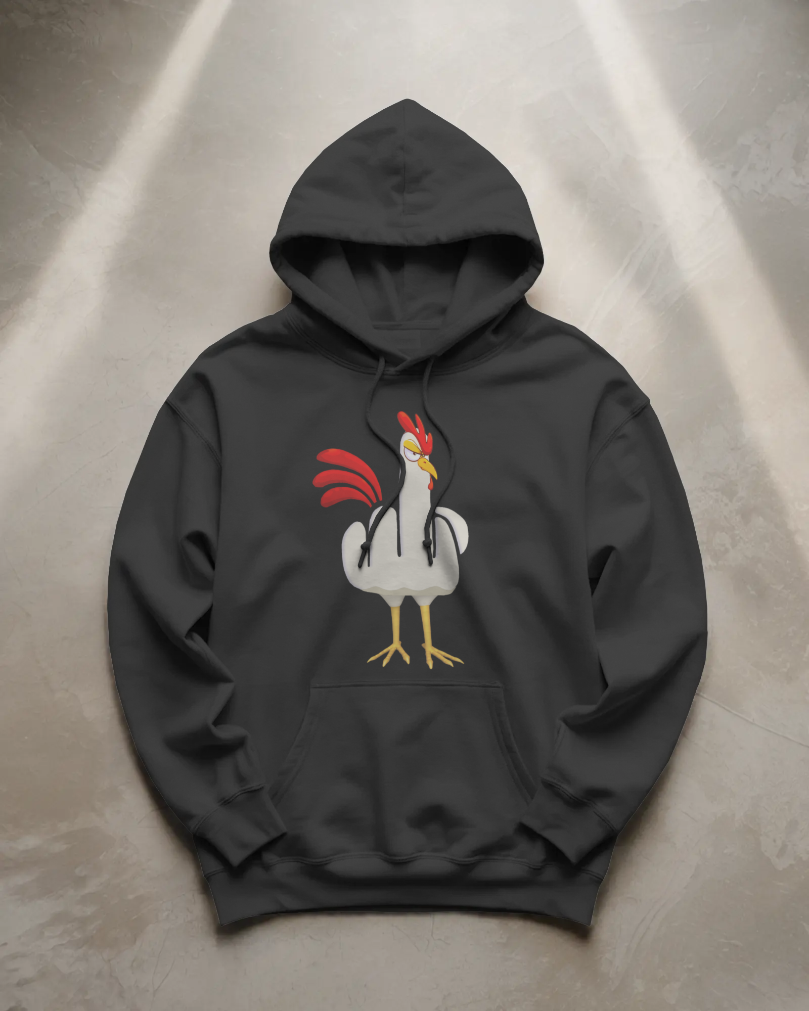 Strut your style with this Cocky Rooster Hoodie, a bold design that embodies attitude and confidence. The front features a vibrant, animated rooster standing tall with a smug grin, chest puffed out, and feathers flared in striking detail—capturing that larger-than-life swagger. The artwork pops against the hoodie’s soft cotton-polyester blend, giving both comfort and durability for everyday wear.