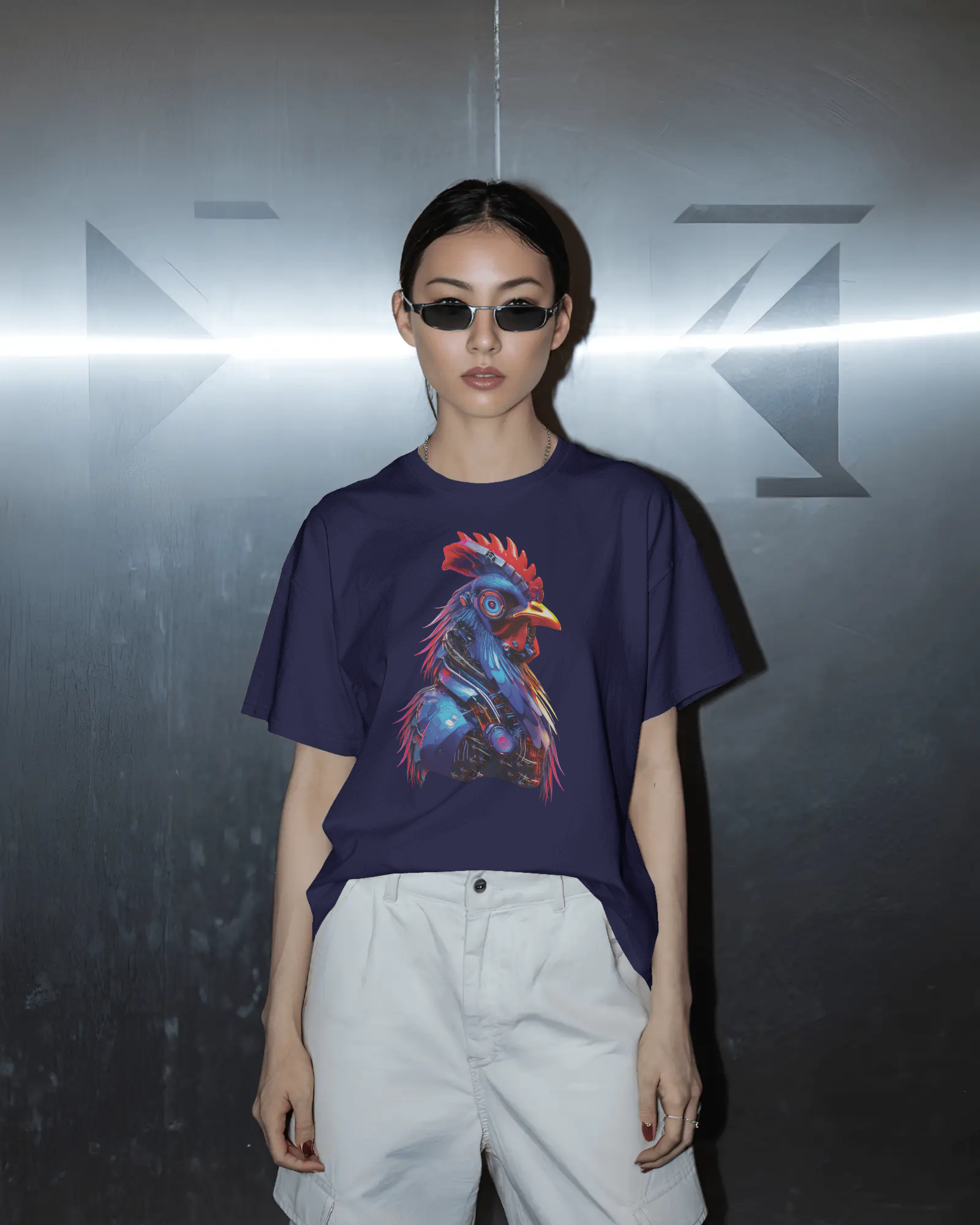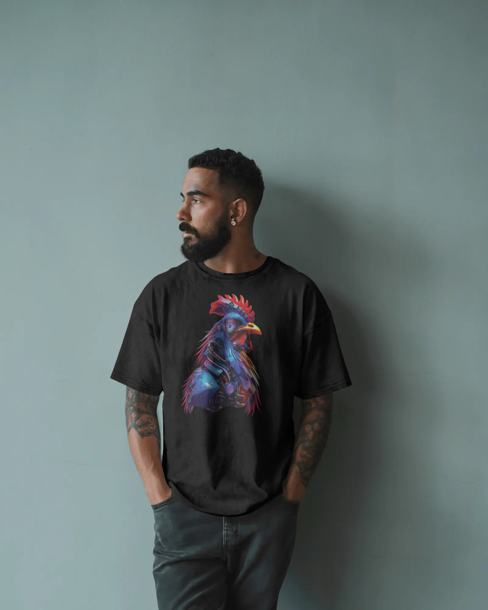 Unleash the clash of nature and machine with this electrifying cyborg rooster design. Vibrant colors fuse with metallic textures to create a futuristic barnyard beast that’s equal parts fearless and unstoppable. The mechanical details pulse with energy, while the rooster’s fiery stance commands attention. Printed on a premium, soft cotton tee, this piece is perfect for anyone who loves bold art, cyberpunk vibes, and standing out in a crowd.