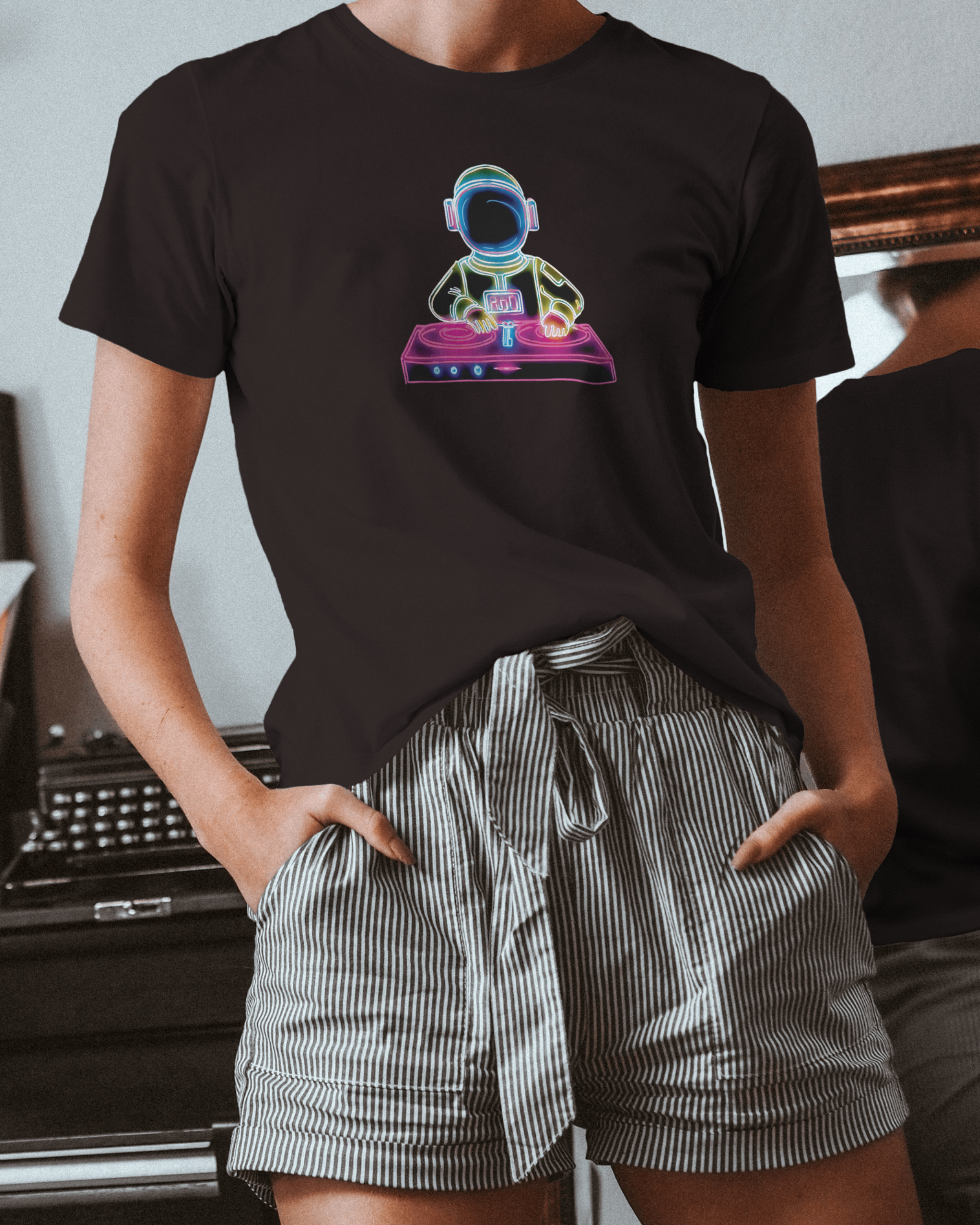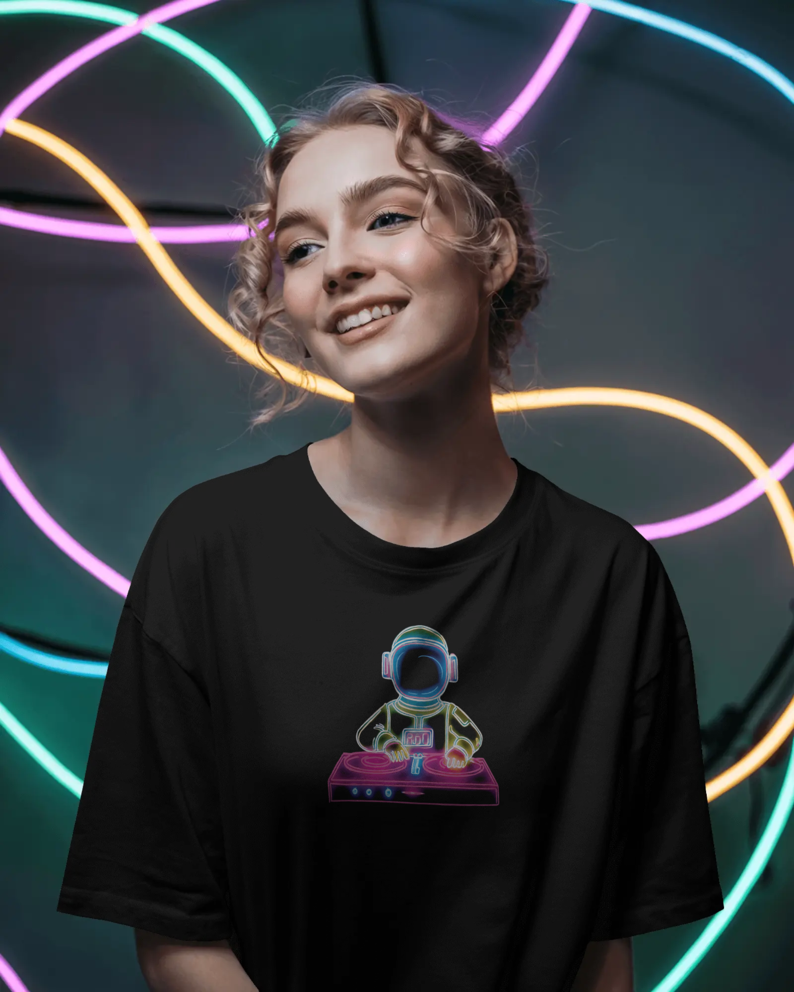 A graphic T-shirt featuring a futuristic astronaut DJ, spinning vinyl records on a sleek turntable. The astronaut’s helmet reflects vibrant neon lights in electric blues, pinks, and purples, while glowing sound waves and laser-like accents radiate outward, suggesting music pulsing through space. The suit is detailed with luminous highlights and cosmic textures, blending sci-fi aesthetics with underground club culture. Overall, the design conveys a high-energy, neon-soaked fusion of space exploration and DJ nightlife, bold and visually striking against a dark background.