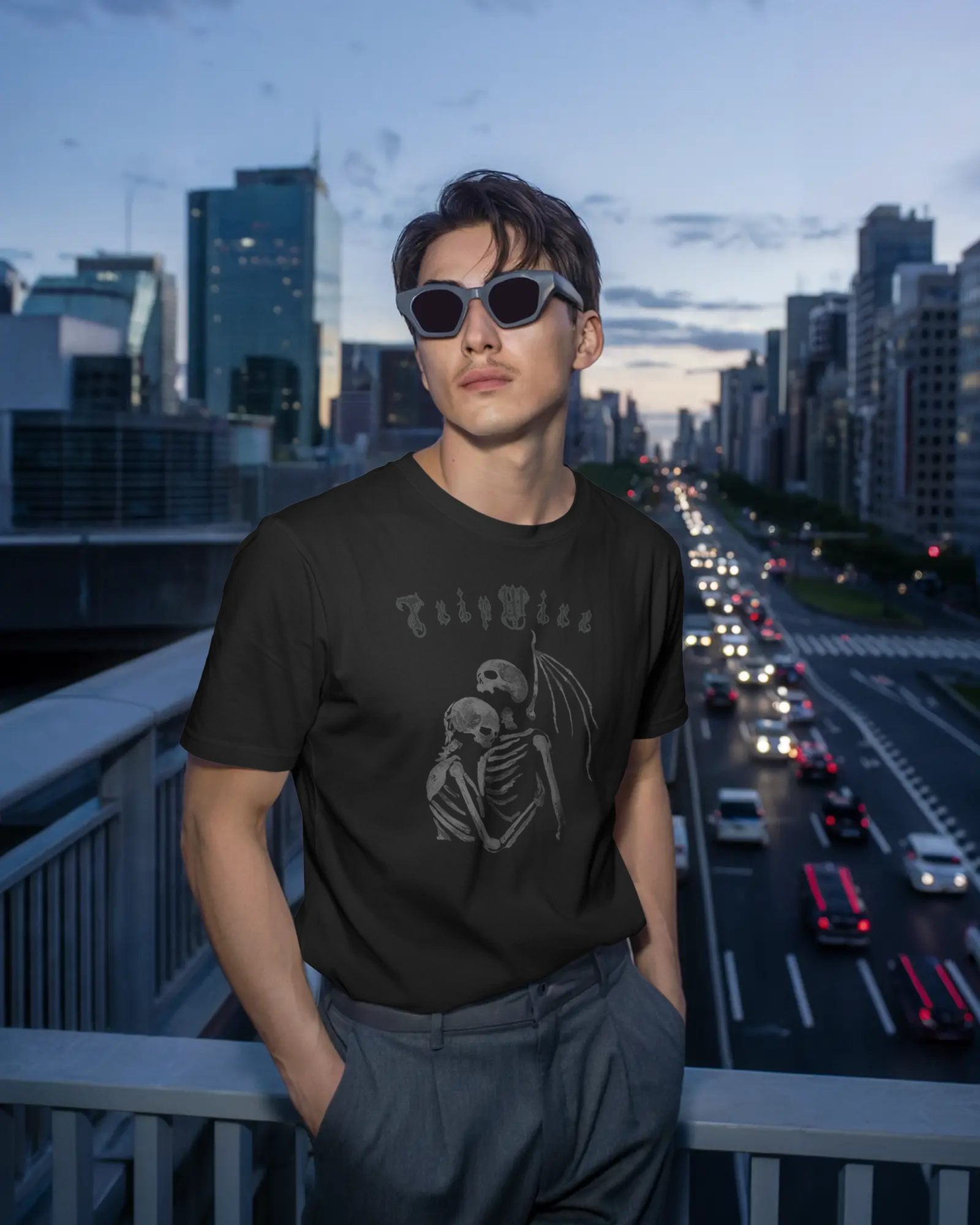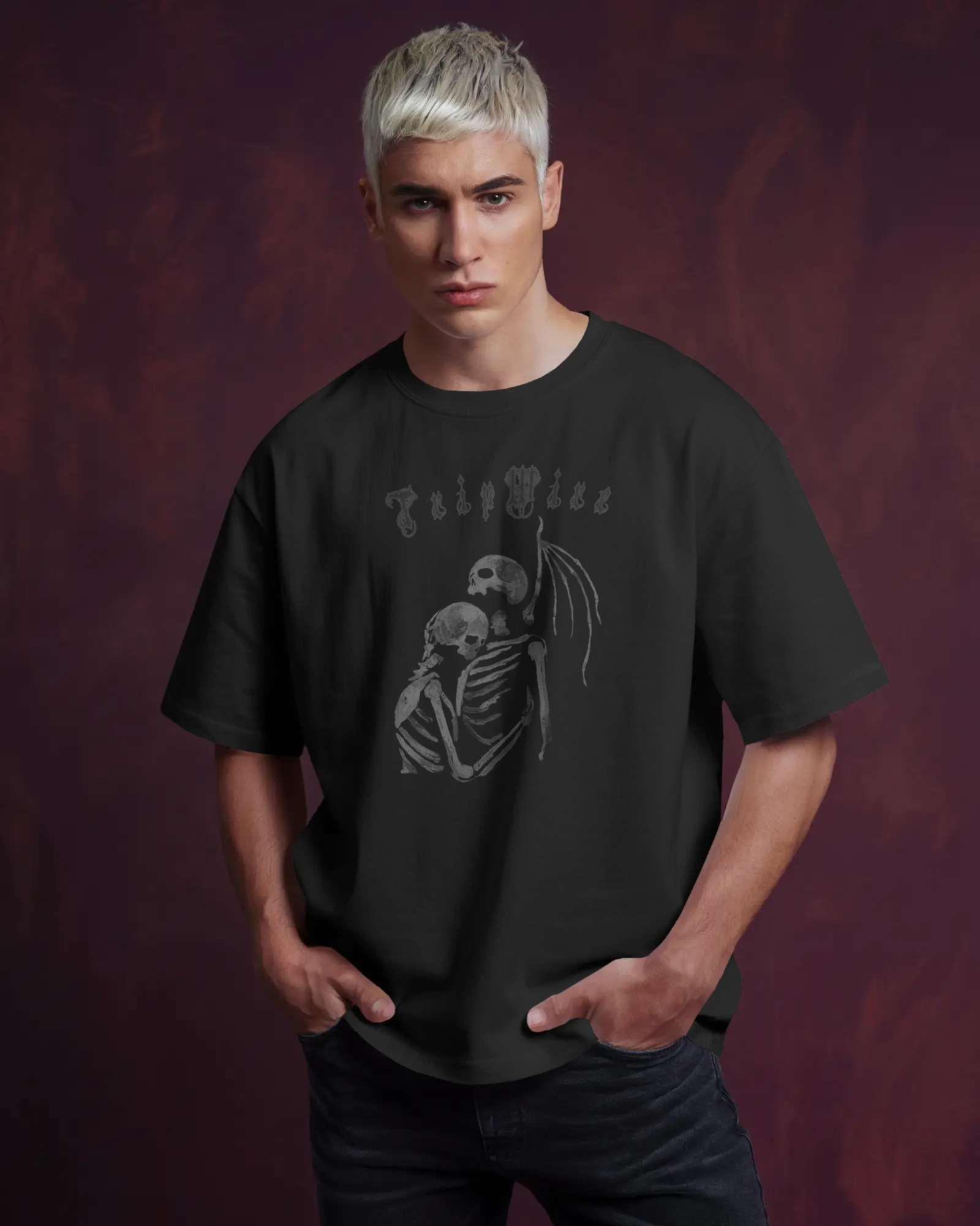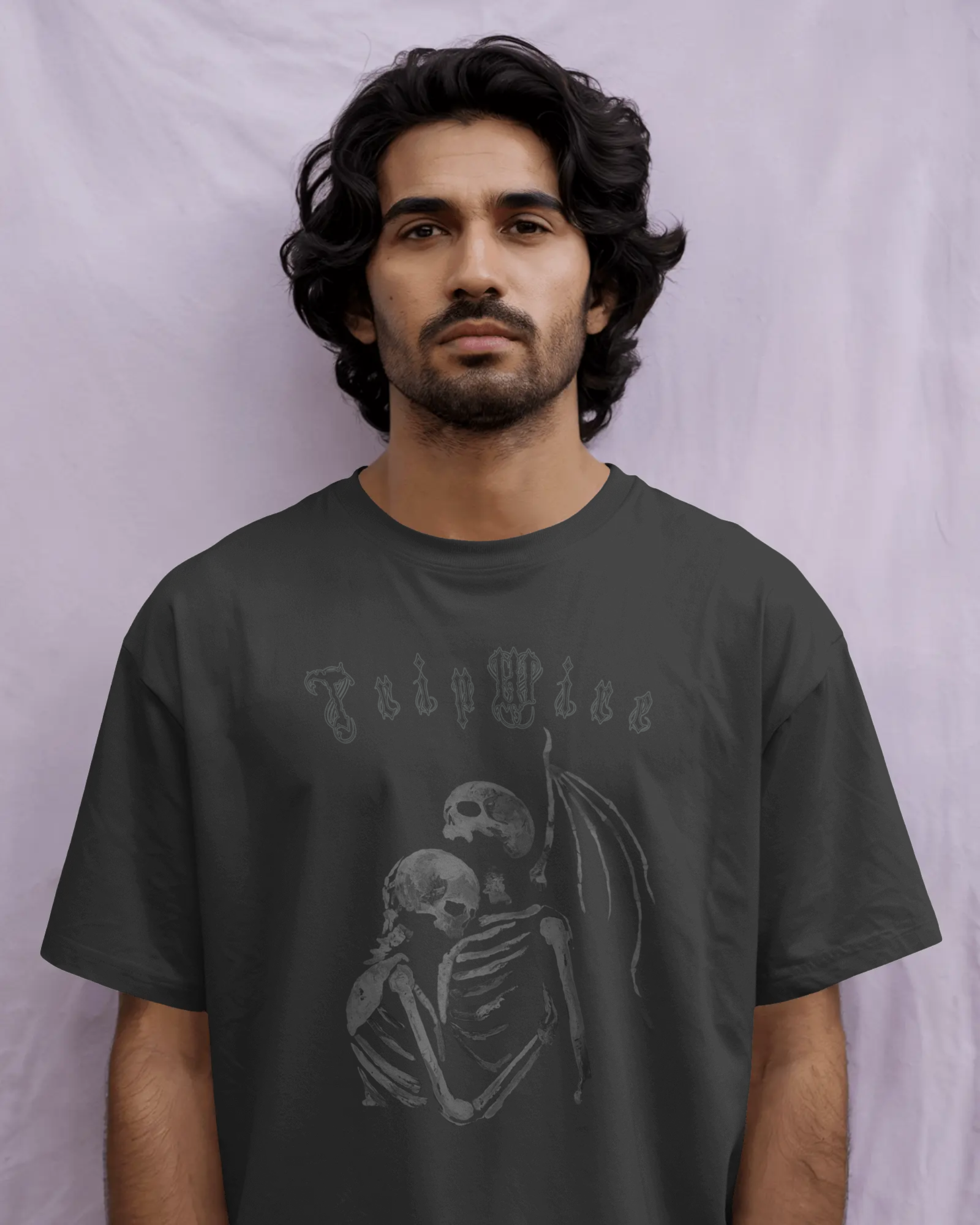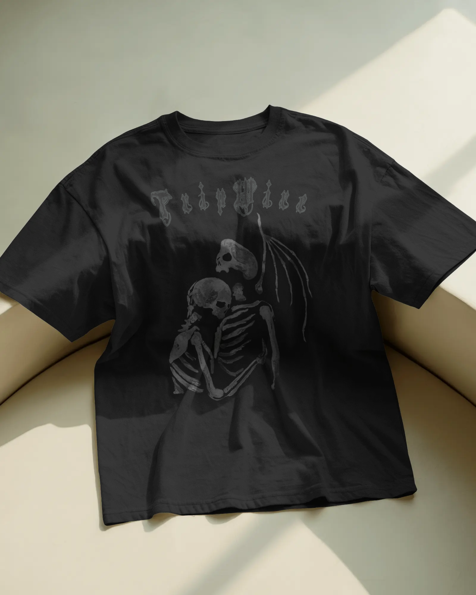 A bold, artistic illustration of two skeletons embracing in a heartfelt hug, created with expressive brush-stroke textures that give the image a raw, hand-painted feel. The strokes vary in thickness, with some rough edges and splattered details that add movement and depth, as if the artwork were painted directly onto the fabric. The skeletal woman and Angel of Death figure are intertwined closely, symbolizing eternal love, unity, and the beauty of connection beyond time. The design balances dark, dramatic lines with softer fading strokes, making it both striking and emotional—perfect for those who appreciate edgy, artistic, and meaningful apparel.